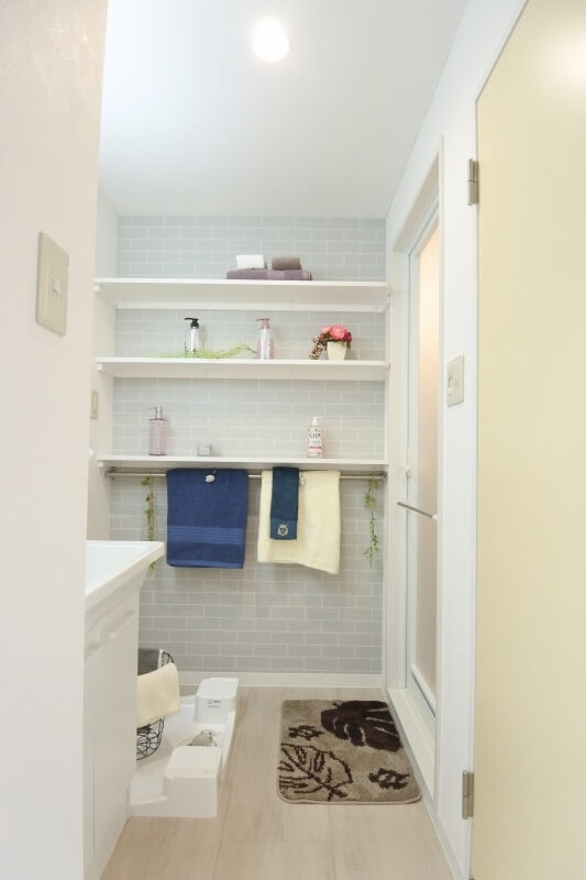 洗面所の棚は奥行・高さを変えて工夫しています。